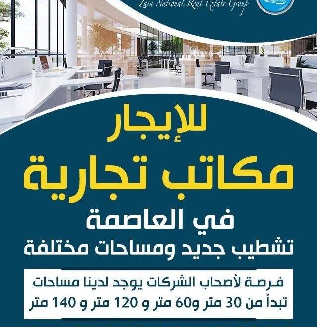 الايجار مكاتب تجاريه في العاصمة تشطيب جديد ومساحات مختلفه تصلح لجميع الانشطه