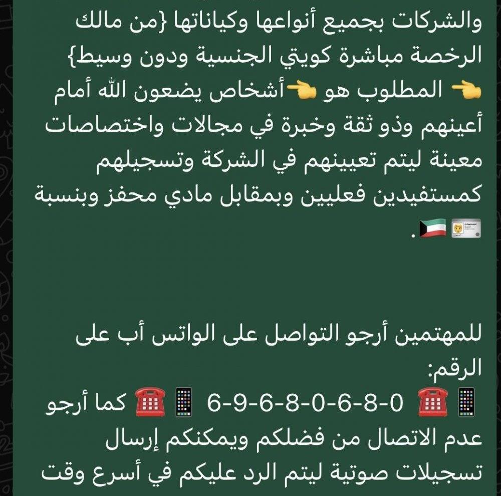 🪪🇰🇼 متوفر لدينا جميع أنواع الرخص التجارية والشركات بجميع أنواعها وكياناتها (من مالك الرخصة مباشرة كويتي الجنسية ودون وسيط) 👈 المطلوب هو 👈أشخاص يضعون الله أمام أعينهم وذو ثقة وخبرة في مجالات واختصاصات معينة ليتم تعيينهم في الشركة وتسجيلهم كمستفيدين فعليين وبمقابل مادي محفز وبنسبة 🪪🇰🇼. 🚨 ومطلوب مسوق عقاري لشركة عقارية كويتية (شرط الخبرة) بيع - شراء - بدل - إيجار - استئجار - إدارة أمـلاك الغير عـمولة 50% وقد تصل إلى 60% أرجو إرسال البيانات والسيرة الذاتية على الواتس أب 🚨 🚨‼️⏰ ومطلوب أيضاً شخص لديه الخبرة في مجال التجارة العامة والاستيراد من الصين لشركة كويتية قائمة ولديها رخصة استيراد عام وبيع المنتجات في الكويت وإدخالها إلى الجمعيات التعاونية والأسواق المركزية 🚨‼️⏰ للمهتمين أرجو التواصل على الواتس أب على الرقم: 📱☎️ 6-9-6-8-0-6-8-0 📱☎️ كما أرجو عدم الاتصال من فضلكم ويمكنكم إرسال تسجيلات صوتية ليتم الرد عليكم في أسرع وقت ممكن.