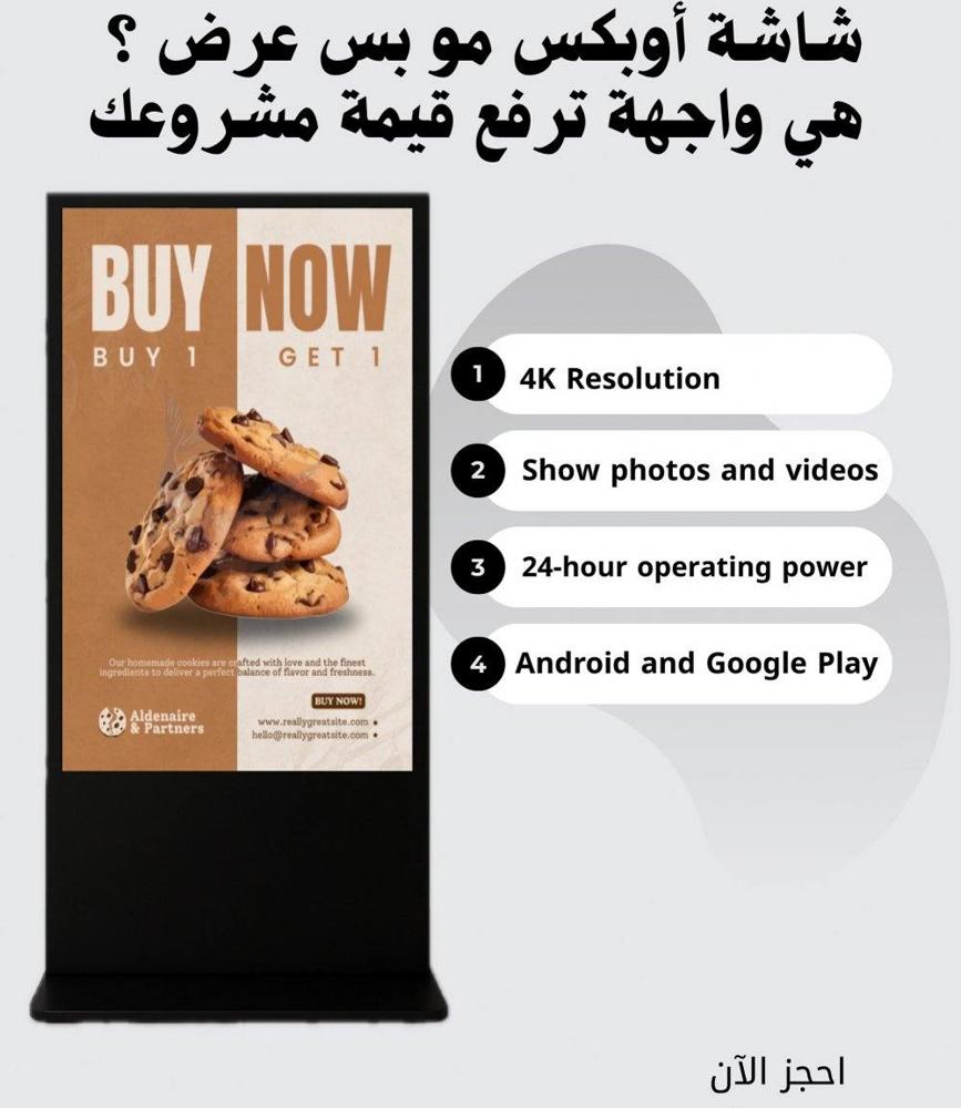 🎯 عروض شاشات العرض من OBIX 📏 الأحجام المتوفرة: • شاشة 43 بوصة • شاشة 55 بوصة ⚙️ المواصفات الفنية: •نظام Android & Google Play •دعم USB و Wi-Fi •خيارات TOUCH و NON-TOUCH •عرض الصور والفيديوهات بسهولة •تشغيل مستمر على مدار الساعة 🛠️ الخدمات المجانية: • تدريب على استخدام الشاشة • توصيل + تركيب مجاني • ضمان سنتين بدون رسوم إضافية
