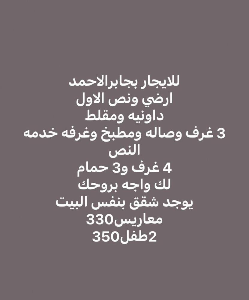 السلام عليكم ورحمه الله وبركاته للتواصل وتساب او عادي للايجار بجابر الاحمد ارضي ونص الاول داونيه ومقلط 3 غرف وصاله ومطبخ وغرفه خدمه النص 4 غرف و3 حمام لك واجه بروحك يوجد شقق بنفس البيت معاريس330 2طفل350 الشقق في نفس البيت وغرفتين وصاله و2 حمام مطبخ مجهز للمعاريس طفلين نفس البيت 300 3 غرف وصاله 2 حمام مطبخ مجهز بكونه 350 طفلين معاريس 330 2 موقف سياره ويوجد شقق اخري في جابر إلاحمد قطعه 2 وقطعه 5