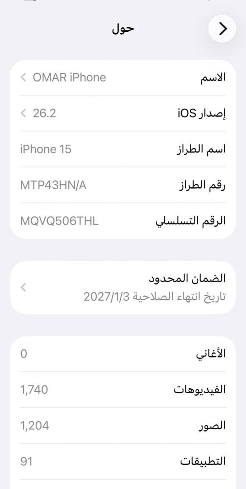 للبيع ايفون 15 العادي سعة 128 اللون الأزرق بحالة الجديد كامل اغراضه مستعمل اقل من اسبوع ودورات الشحن 4 مرات فقط فيه كفاله سنه كامله عليه ستيكر من بانزر اصلي وكفر ابل الأصلي وكرتونه والشحن السعر نهائي الرجاء عدم الاتصال لغير هذا السعر