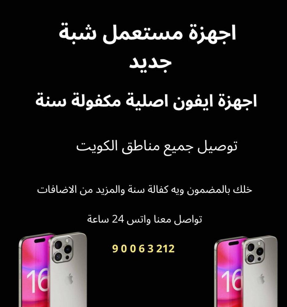 � آيفونات مستعملة بحالة ممتازة ✅ كفالة سنة لكل جهاز 📚 متوفر أيضًا آيباد، ✏️ أقلام و🎧 سمّاعات 🎁 مع كل عملية شراء هدية: سماعة واير + شاحن + كفر 🚚 توصيل سريع داخل الكويت 💬 للحجز أو الاستفسار تواصل واتساب مباشر✨ تواصل الآن واستمتع بأفضل العروض
