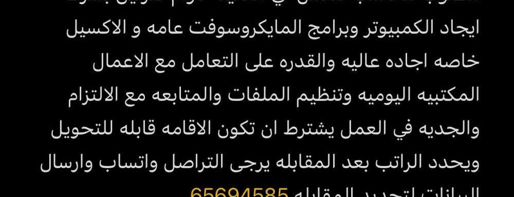 � مطلوب مديرة مكتب تعلن شركتنا عن حاجتها إلى مديرة مكتب للعمل ضمن فريق إداري مميز. ✅ الشروط: الجنسيه من بلاد الشام • حسن المظهر واللباقة • الخبرة غير شرط (الإدارة تقوم بالتدريب) • القدرة على حل المشكلات والتعامل مع الضغوط • إجادة استخدام الكمبيوتر (وورد / إكسل / بريد إلكتروني) • الالتزام والانضباط 📍 مكان العمل: (السالمية شارع البلاجات) ⏰ ساعات العمل: (من 4 مساء الى 9:30 مساء ) 📩 للتقديم يرجى إرسال السيرة الذاتية مع الصورة الشخصية و العمر على واتساب
