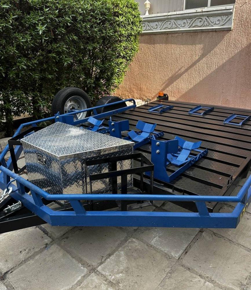 للبيع للجادين والصامل عربانة للدراجات النارية (مخزنة) استخدام مرتين فقط وشبه جديدة تشيل ٣ دراجات نارية أو دراجتين بحجم القولد وينج فيها صندوق عدة كبير - ٢ فلشر على الصوبين - مكانين لتوانكي البنزين - اسبير تاير لون ازرق