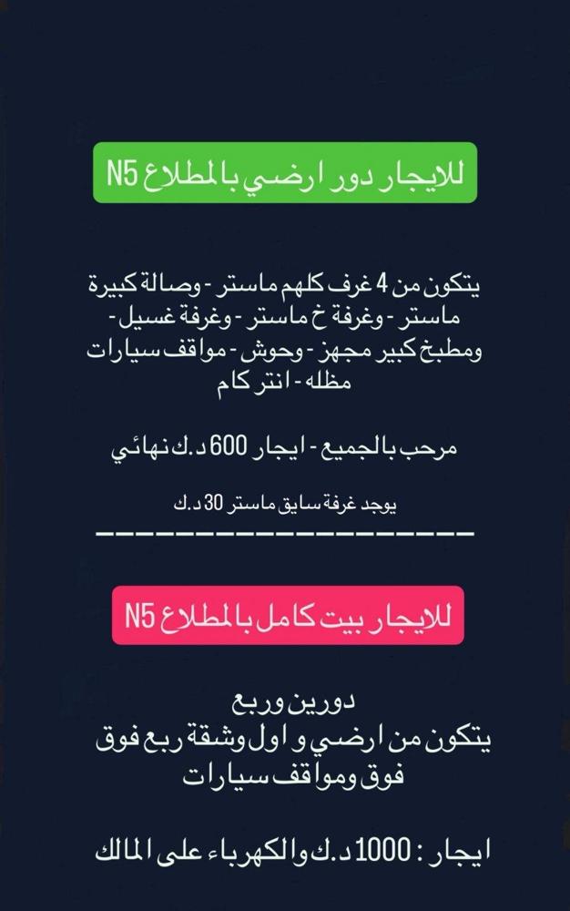 للايجار دور ارضي بالمطلاع N5 يتكون من 4 غرف كلهم ماستر - وصالة كبيرة ماستر - وغرفة خ ماستر - وغرفة غسيل - ومطبخ كبير مجهز - وحوش - مواقف سيارات مظله - انتر كام مرحب بالجميع - ايجار 600 د.ك نهائي يوجد غرفة س ماستر 30 د.ك ____________________________ للايجار بيت كامل بالمطلاع N5 دورين وربع يتكون من ارضي واول وشقة ربع فوق فوق ومواقف سيارات ايجار : 1000 د.ك والكهرباء على المال