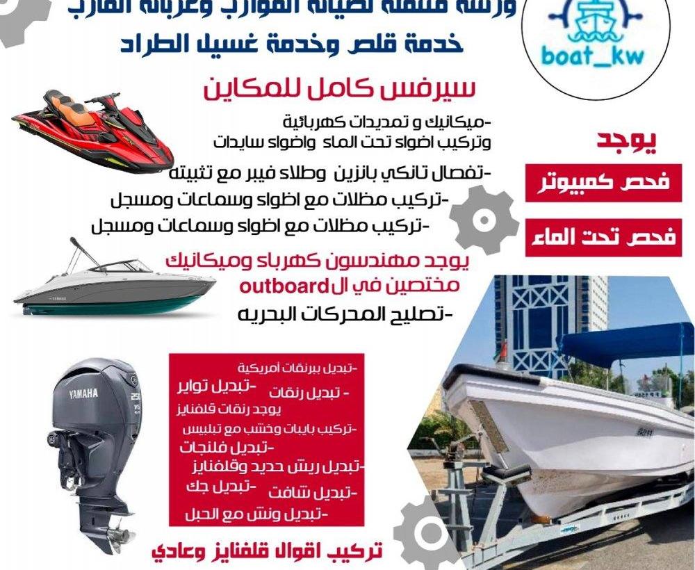 نرحب بكم في ورشة 🛠 , نقدم لكم خصومات ممتازة على جميع خدمات الصيانه البحرية . •صبغ فيبر •بوليش•انتي فولينج مكائن وميكانيك مكائن داخلية وخارجية وجتسكي . كهرباء وتمديدات كهربائية واضواء وسماعات . تصليح عربانة بلكامل + تفصال عربانه فحص كمبيوتر تنجيد مقاعد كامل وتركيب ارضيات . قلص وسحب طراريد كهرباء وميكانيك جميع انواع المكائن +ورشة متنقلة لصينة وتفصال عربانه جديده لصيانة العرباين تبديل بوبرنقات تواير تفصال ورشة متنقله للعرباين مختصون في العرباين جميع مايخص العربانه من صبغ وصيانه نقلص ونسحب عرباين طراد وجت سكي تبديل بيرنقات تبديل تواير ورنقات قلفنايز ضد الصدا تركيب اقوال قلفنايز ضد الصدا تركيب شافت قلفنايز وحديد ريش قلفنايز وحديد تركيب جيك لسان سيفتي تركيب ونش وحبل تبديل خشب مع تلبيس تبديل بايبات. يوجد ميكانيكي مختص بلطراريد والمكاين ويوجد كهربائي وزينة للطراد الادارة كويتيه والورشه رقم 1 بلكويت
