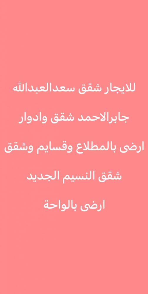 للايجار قسيمة دورين مفصولين بالمطلاعN7؛ ارضى بروح واول بروح؛ بيت زاوية رواق القطعه؛ مدخل ومخرج سهل جداً؛ مصافط مظله متوفرة: الارضى: ديوانية+صالة كبيرة+3غرف+ غ سااائق+غ عااامللة+غ غسيل+مطبخ؛ اسرة كويتى ايجار 600 بنفس البيت الدور الاول: 4غرف+صالة+بلكونة+غرفة عااامله+ غ غسيل+مطبخ؛ 4مصافط مظله؛ مع امكانية استخدام السطح؛ ايجار530 للايجار قسيمة دورين ونص المطلاعN3؛ ارضى واول دوبلكس؛ وشقه بروحها بالثانى مع الروف؛ ايجار900 غير شامل 🌺 🌺 🌺 للايجار بسعدالعبدالله ق11 شقه للمعاريس بيت 3جهات؛ مصفطين: 3غرف+صالة+حمامين+مطبخ؛ ايجار 330 للايجار بسعدالعبدالله ق11 شقه لمعرس او اسرة 3أطفال: 3غرف+صالة+حمامين+مطبخ؛ ايجار350 للايجار بسعدالعبدالله ق9 شقه بيت زاوية: 3غرف+صالة+حمامين+مطبخ؛ لمعرس او 3أطفال ؛ايجار350 🌺 🌺 🌺 للايجار بجابرالاحمد ق7 شقه بدون المالك: 3غرف+صالة+3حمامات+مطبخ+غرفة عامل؛ لمعرس او 3أطفال؛ ايجار350 للايجار بجابرالاحمد ق7 شقه: 3غرف+صالة+حمامين+مطبخ؛ لمعرس او طفل؛ ايجار350 للايجار دور ثانى مصعد جابر ق6: 4غرف منهم جناح كبير+صالة+4حمامات+مطبخ؛ ايجار600 للايجار بيت حكومى جابرالاحمد؛ ايجار1100 🌺 🌺 🌺 للايجار بالنسيم الجديد ق3شقه: 3غرف+صالة كبيرة+غرفة عامل+3حمامات +مطبخ؛ لمعرس او طفلين؛ ايجار 400 للايجار دور ارضى بالواحة ق2 نظيف؛ مصافط متوفرة: 4غرف+صالة+ديوانية+3حمامات+مطبخ؛ ايجار 650