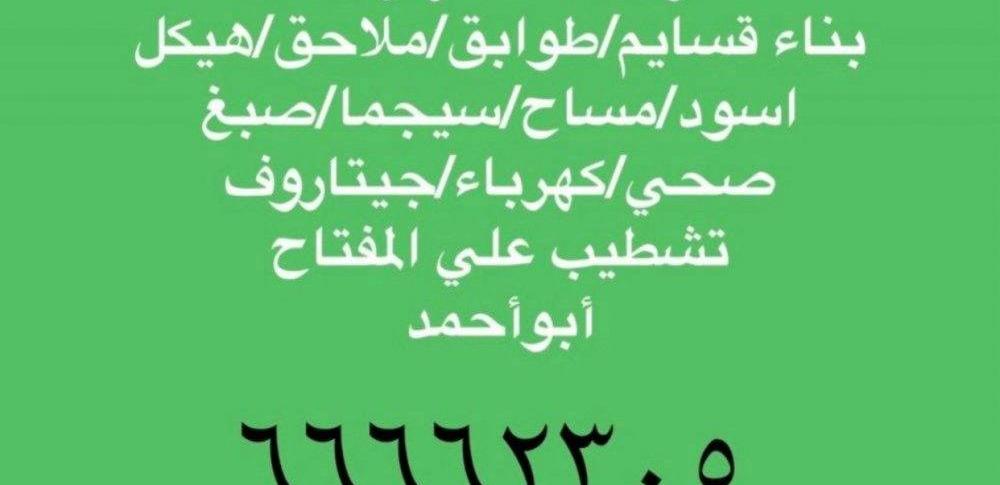 مقاولات صبغ وديكورات حديثة 🎨 صبغ داخلي وخارجي – ورق جدران – بديل خشب ورخام ✨ دهانات مؤثرات – معالجة تشققات ورطوبة 🛠️ تركيب لمسات فنية وديكورات عصرية – شغل نظيف ومضمون شقق – بيوت – محلات 🏠 أسعار مناسبة والتزام بالمواعيد ✔️ 📞 واتساب / اتصال–مع أبو رحيم & أبو حمزة – نخدم جميع مناطق الكويت تجديد – تصميم – ديكور مبتكر – خبرة – احترافية – حلول سريعة – جمال – جودة عالية – خامات ممتازة – توفير – عناية – تفاصيل دقيقة – إبداع – أناقة – ذوق رفيع – تشطيبات – خامات أصلية – مظهر فاخر – متانة – تصميم عصري – تنسيق ألوان – تركيب ممتاز – صيانة دائمة – خدمة مميزة