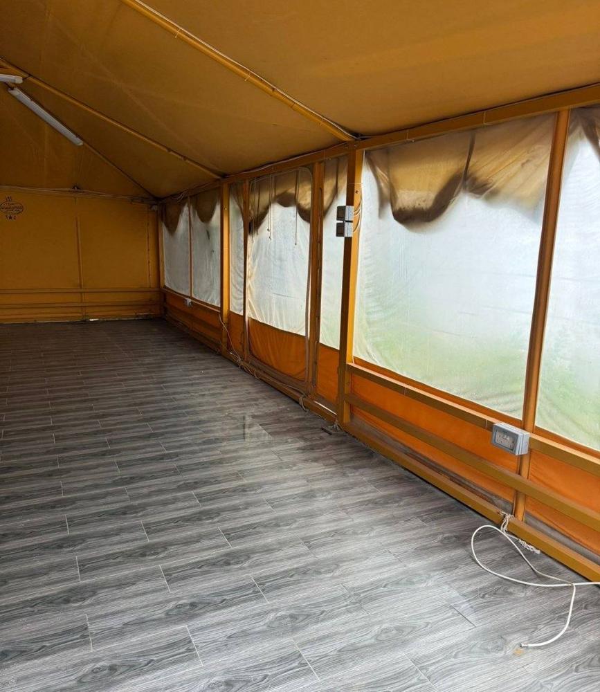 للبيع خيمة الصباح ٩*٥ من داخل اصفر من مصنع الصباح على هيكل حديد بدون جمالون وبالاضافه إلى عدد اثنين رواق شفاف فيها ملاحظات بسيطه