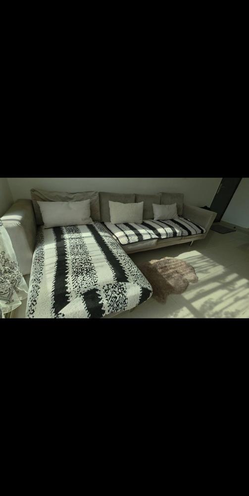 This is an elegant L-shaped sofa in a soft beige tone with a clean, modern design. Its plush fabric and low-profile back make it both comfortable and stylish, while the neutral cushions and black-and-white throws add subtle contrast. The chaise extension and natural light enhance its calm, luxurious feel, making it perfect for relaxing or entertaining.
