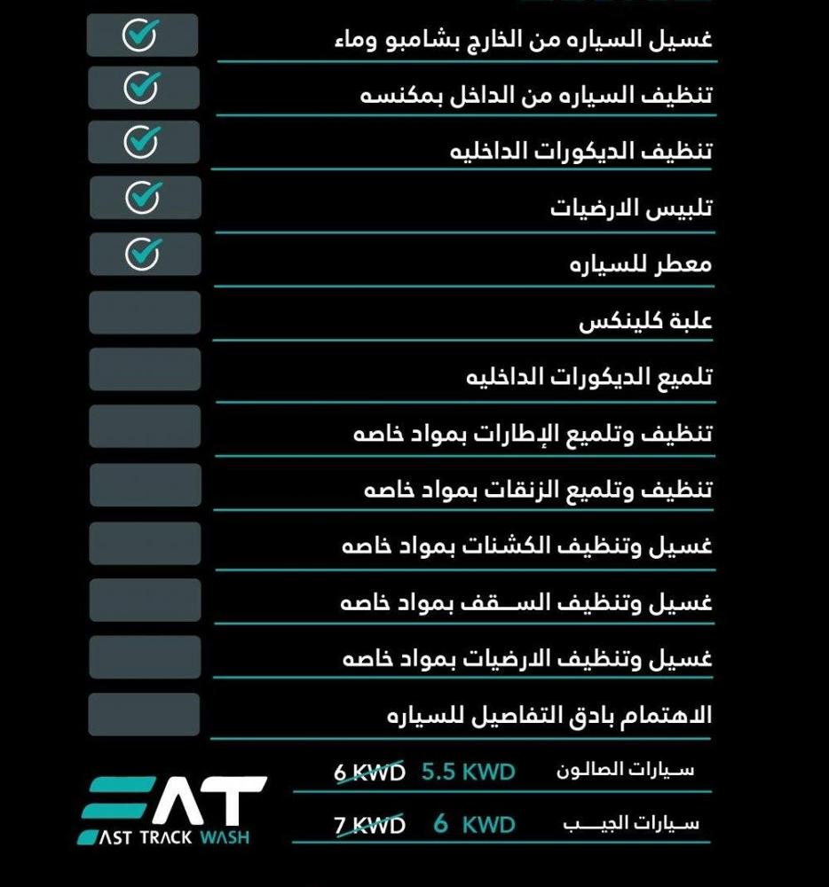 غسيل السياره من الخارج بشامبو وماء تنظيف السياره داخل بمكنسه تنظيف الديكورات الداخليه تعطير السياره تلميع الديكورات الداخليه بالكامل تنظيف وتلميع الإطارات بمواد خاصه تلبيس الارضيات ازالة جميع البقع في الكشنات اداره كويتيته .. جميع المواد المستخدمه ايطاليه ذات جوده عاليه يوجد بوليش حسب الطلب يوجد سنفره ليتات اماميه حسب الطلب