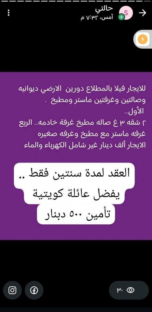 للايجار بيت كامل في الأندلس دورين مفصولين يصلح لسكن عائلتين أو عائلة واحدة الدور الأرضي ٤ غرف نوم وصالة ومطبخ وغ خ وديوانية وحوش واسع ...الدور الأول ٤ غرف نوم وصالة ومطبخ وغ خ وحوش وكراج تابع للدور الأول الايجار للبيت كامل ١٥٠٠ دينار بدون الكهرباء والماء. ..وممكن الايجار للأدوار منفصلة الأرضي ٨٠٠دينار والأول ٨٠٠ دينار ##### للايجار بيت كامل في المطلاع n8 دورين ارضير وشقتين تشطيب جديد ... الأرضي غرفتين وديوانية وصالة ومطبخ ..الشقق كل شقة ٣ غرف نوم وصالة ومطبخ وغ خ.الايجار ألف دينار غير شامل الكهرباء والماء + تأمين ٥٠٠ دينار ت 944/23000