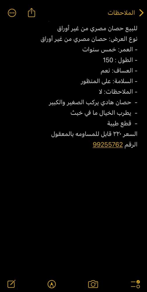 ‏للبيع حصان مصري من غير أوراق ‏‎نوع العرض: حصان مصري من غير أوراق - العمر: خمس سنوات - الطول : 150 - العساف: نعم السلامة:على المنظور - الملاحظات: لا - ⁠ حصان هادي يركب الصغير والكبير - ⁠ يطرب الخيال ما في خبث - ⁠ قطع طيبة رقم التلفون : ‭‬ ‭‬ ‭‬