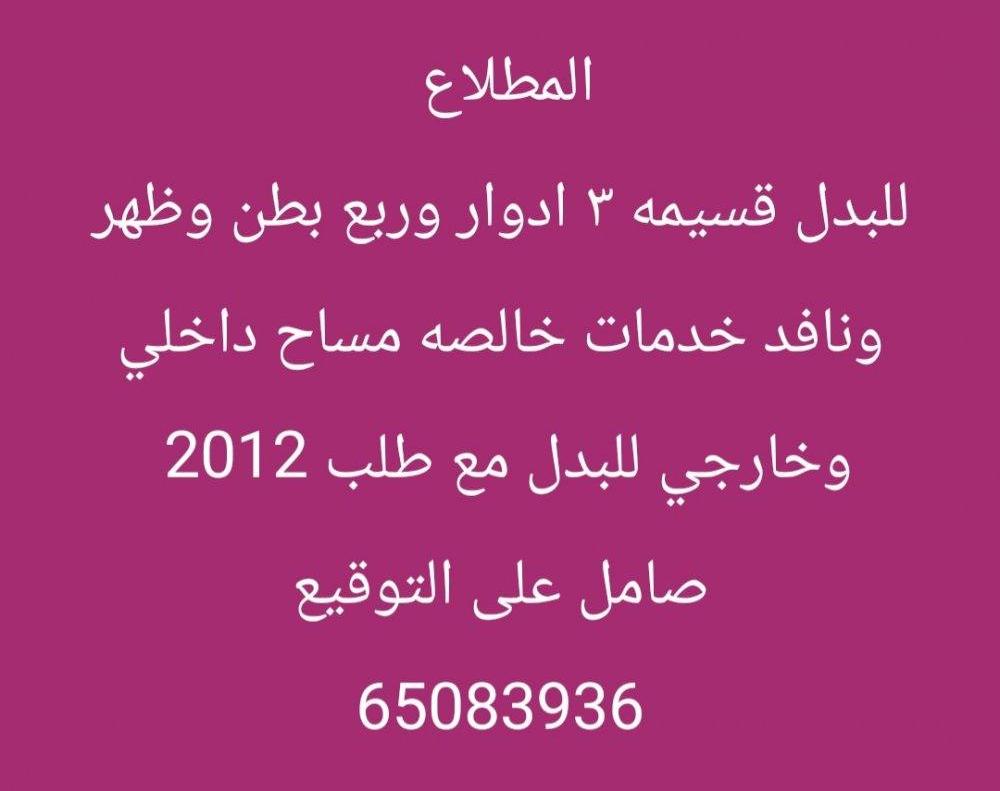🏡🏡عروض البدل بالمطلاع 🏡🏡 🏡للبدل راس شيخ 3 شوارع رواق ارتداد [ 9+20×60 ] للبدل مع سد ونافد بسعر لقطه 🏡للبدل راس ارتداد كبير للبدل مع زاويه او بطن وظهر 🏡للبدل بطن وظهر رواق ارتداد [ 9+30 ] للبدل مع سد 🏡للبدل زاويه شارعين ارتـداد كبير للبدل مع سد 🏡للبدل زاويه شارعين شارع عام للبدل مع سد بسعر مناسب 🏡 للبدل قسيمه بالمطلاع زاويه شارعين ٣ ادوار وربع مع بيت حكومي بسعد جاد 🏡🏡 عروض المطلاع مع طلبات 🏡🏡 🏡للبدل راس 3 شوارع ارتداد عادي للبدل مع طلب 2012 وماقبل 🏡للبدل قسيمه بطن وظهر سرداب و٣ ادوار تشطيب ممتاز للبدل مع طلب 2008 وماقبل 🏡 للبدل قسيمه زاويه شارعين دورين ونص نواقص داخليه مع طلب 2012 وماقبل بسعر لقطه 🏡 للبدل شارع وسكه مع طلب 2011 وماقبل بسعر طيب 🏡للبدل شارع واحد مع طلب 2012 وماقبل بسعر طيب جاد 🏡🏡عروض خيطان مع طلبات 🏡🏡 🏡 للبدل بطن وظهر رواق ارتـداد [ 6+18 ] للبدل مع طلب 2012 وماقبل 🏡للبدل شارع واحد ارتداد وخدمات مع طلب 2009 وماقبل 🏡للبدل شارع واحد مع طلب 2009 وماقبل 🏡للبدل شارع واحد بخيطان مع موقع