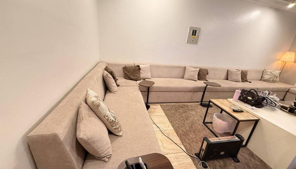 جلسه شكل حرف L - المقاس 5.8 / 6.16 ( مع ٨ طاولات تقديم )