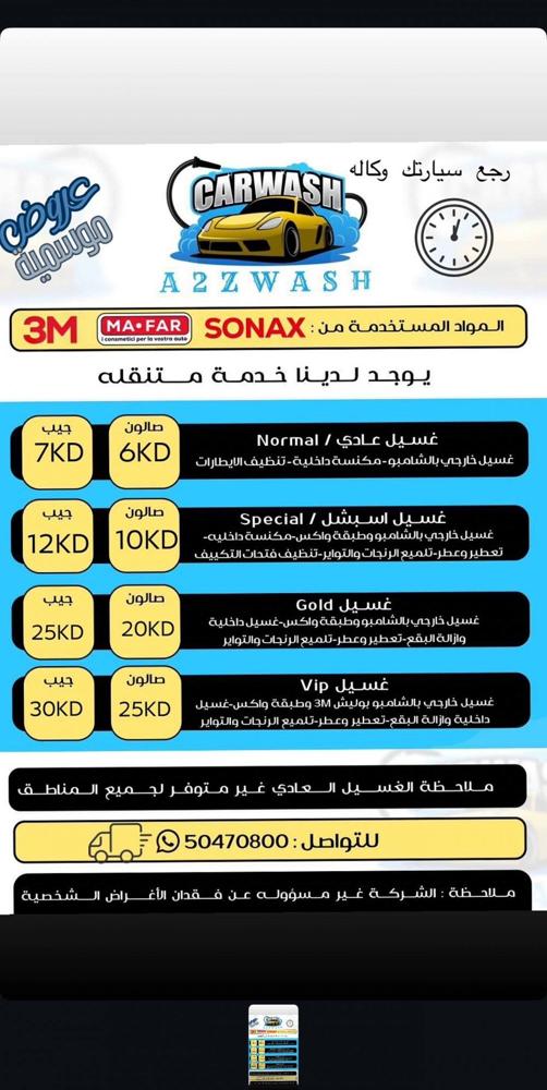 باقات الغسيل غسيل العادي - ⁠- غسيل خارجي بالشامبو - مكنسة داخلية - تكييس الارضيه + كيس زباله الصالون 6 الجيب 7 سبيشال - ⁠- غسيل خارجي بالشامبو مع طبقة واكس - مكنسة داخلية + تلميع الديكورات - عطر + تعطير + كلينكس - تلميع الرنجات والإطارات - تنظيف فتحات التكيف - تكييس الارضيه + الكشنات + السكان + القير + كيس زباله غسيل تحت السياره (علي طلب الزبون) الصالون 10 الجيب 12 الذهبي - ⁠- غسيل خارجي بالشامبو مع طبقة واكس - غسيل الداخلية + ازالة البقع + تلميع الديكورات+ازالة الروائح الكريهه في المكيف - تعطير + عطر + كلينكس - تلميع الرنجات و الأطارات - تكييس الارضيه + الكشنات + السكان + القير + كيس زباله - غسيل تحت السياره ( علي طلب الزبون) غسيل المكينه بمواد مخصصه( علي مسؤولية الزبون+علي طلب الزمون) الصالون 20 الجيب 25 ‏Vip - ⁠- غسيل خارجي بالشامبو مع طبقة واكس وبوليش M3 - غسيل داخلية + ازالة البقع + تلميع الديكورات+ازالة الروائح الكريهه المكيف - تعطير + عطر + كلينكس - تلميع الرنجات و الأطارات - تكييس الارضيه + الكشنات + السكان + القير + كيس زباله غسيل تحت السياره ( علي طلب الزبون) غسيل المكينه بمواد مخصصه(علي مسؤولية الزبون+علي طلب الزبون) الصالون 25 الجيب 30