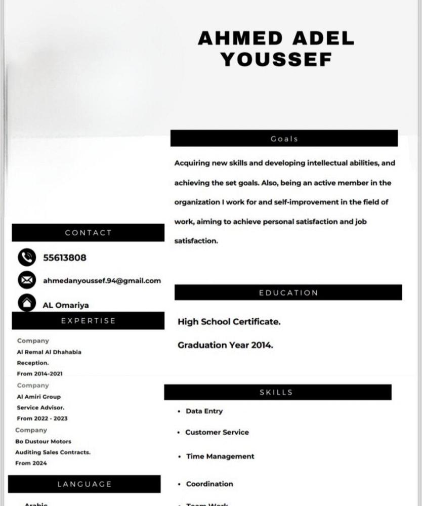 مستعد للعمل لدي خبره في الاستقبال والتنسيق خدمة العملاء ـ استقبال المكالمات وطباعة تقارير ـ تدقيق على عقود البيع ـ ادخال البيانات سوءآ سيستم او اكسيل واكتب كتب للادارة