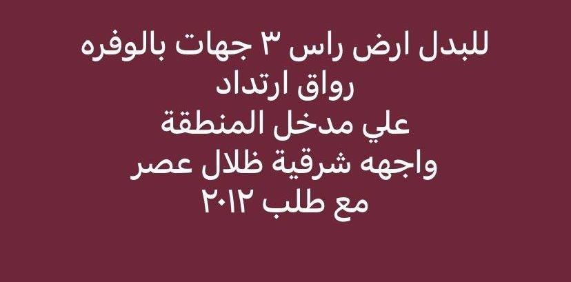 للبدل ارض راس ٣ جهات بتوسعة ألوفره رواق وارتداد واجهه شرقية ظلال عصر علي مدخل المنطقة مع طلب ٢٠١٢ 🌹🌹🌹🌹🌹🌹🌹🌹🌹 للبدل قسيمة بطن وظهر دورين وربع القسيمة بها نواقص ٥ الاف مع طلب ٢٠١٢