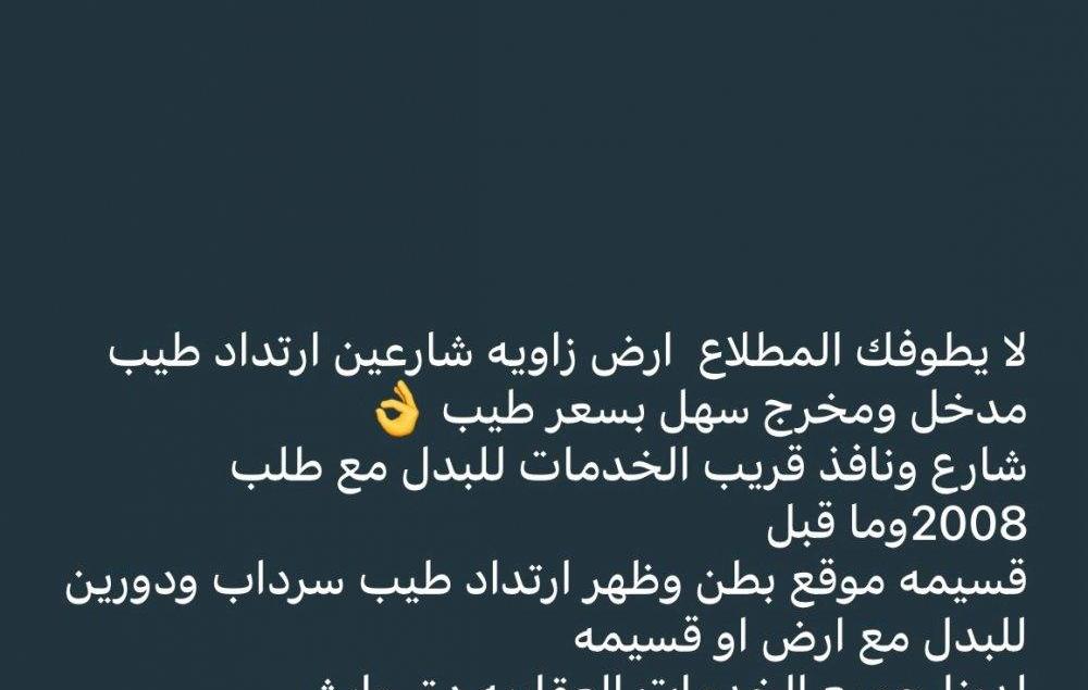 عروض المطلاع وجميع المناطق زاويه شارعين ارتداد طيب مدخل ومخرج سهل للبدل مع سد بسعر طيب شارع ونافذ قريب الخدمات للبدل مع طلب 2008وما قبل بطن وظهر ارتداد طيب رواق للبدل مع سد زاويه شارعين قريب الخدمات مع سد قسيمه موقع بطن وظهر ارتداد طيب مؤجره سرداب ودورين وربع للبدل مع ارض او جاهز زاويه شارعين مقابل خدمات للبدل مع سعد العبدالله زاويه شارعين ارتداد 40متر مقابل الخدمات للبدل مع سد خدمات او موقع اقل زاويه شارعين للبدل مع طلب 2012 بطن وظهر شارع رئيسي مع طلب 2012 قسيمه دورين وربع موقع سد بها نواقص للبدل مع طلب 2012 قسيمه علي الاسود ثلاث ونص للبدل مع طلب 2012 جابر الاحمد قسيمه ثلاث ادوار موقع راس ثلاث جهات علي الاسود للبدل مع طلب 2001وما قبل قسيمه جابر الاحمد سرداب وثلاث وربع موقع سد تشطيب جديد سوبر ديلوكس مع المطلاع او طلب 2012وما قبل بيت حكومي بجابر الاحمد للبدل مع طلب 2008وما قبل قسمه سعد العبدالله دورين وربع للبدل مع المطلاع صباح الاحمد بطن وظهر ونافذ ارض للبدل مع المطلاع قسيمه موقع سد بجنوب عبدالله سكن المالك ثلاث وربع للبدل مع ارض موقع سد بخيطان ارض للبدل مع طلب 2012او المطلاع شارع ونافذ بخيطان للبدل مع طلب 2008وما قبل شيخ السد بخيطان للبدل مع المطلاع موقع الوفره راس ثلاث جهات ارتداد طيب للبدل مع طلب 2012 قسيمه خالصه دورين تشطيب سوبر ديلوكس موقع بطن وظهر للبدل مع طلب 2012 لدينا جميع الخدمات العقاريه بيع بدل وإيجار نستقبل عروضكم ونلبي طلباتكم