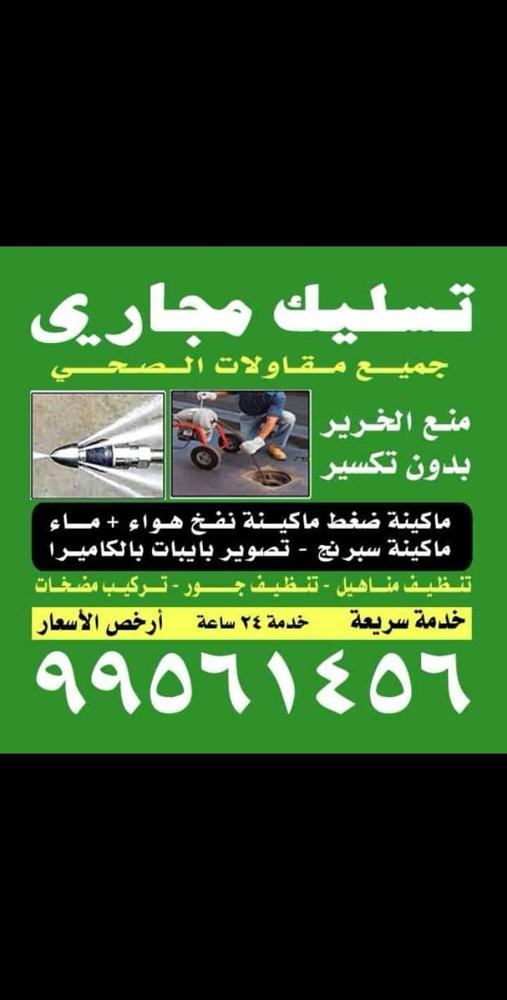 تسليك مجاري حمامات ومطبخ بأحدث المكاين السبرنج الكهربائية مكينة ضغط ماء وهواء وإزالة الرائحة الكريهة غسيل البايبات بالمكيينة ضغط ماء وهواء تصليح وتركيب وصيانة المكاين تنظيف الجوره تركيب غطيان المناهيل وجميع أعمال الصحي بأقل الاسعار خدمة ٢٤ساعه جميع مناطق الكويت