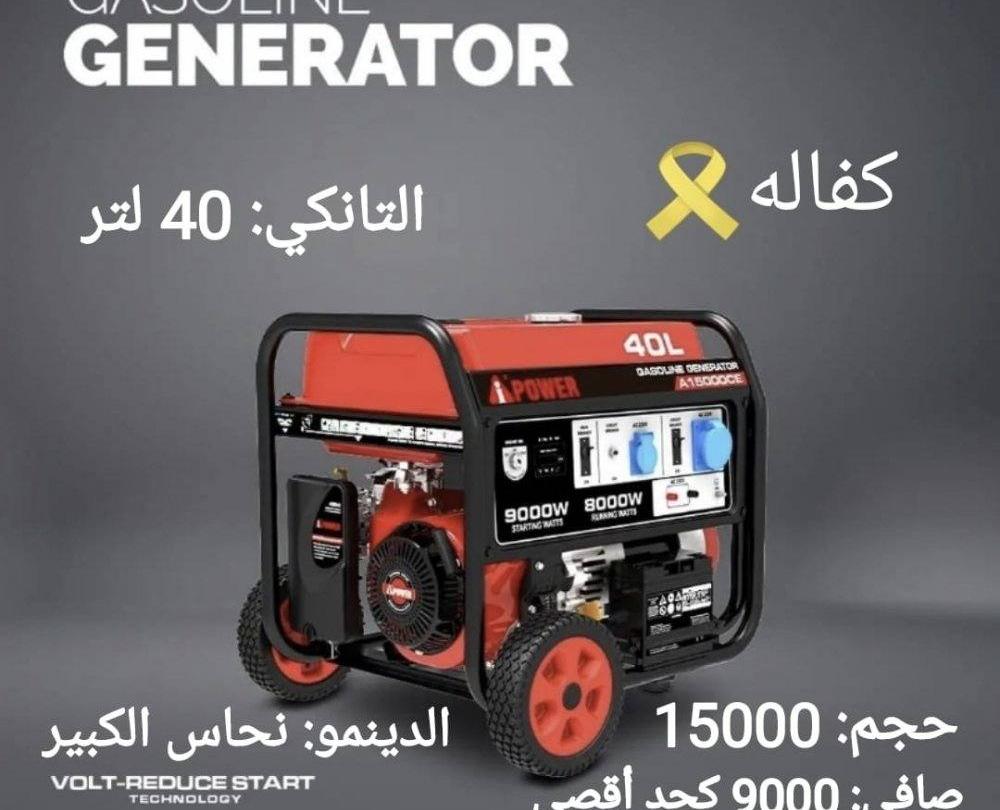للبيع مواطير جديدة بالكرتون بأقل الاسعار ماركة : aipower الأحجام (15000 و 12000) الحجم : 15000 الصافي: 9000 واط كحد أقصى الدينمو : نحاس الكبير التانكي : 40 لتر الكبير الحجم : 12000 الصافي : 8000 واط كحد أقصى الدينمو : نحاس التانكي : 40 لتر الكبير يشغل تكييف - فودترك - مقاولات هلتي صاروخ - بقالات - وغيرها من الكهربائيات جميع القطع الغيار متوفره لدينا من المصنع (عرض خاص الجمله) ملاحظه: قبل لا تتصل شوف سعرها بالسوق وبعدها اتصل اللهم ارزقني وارزق مني