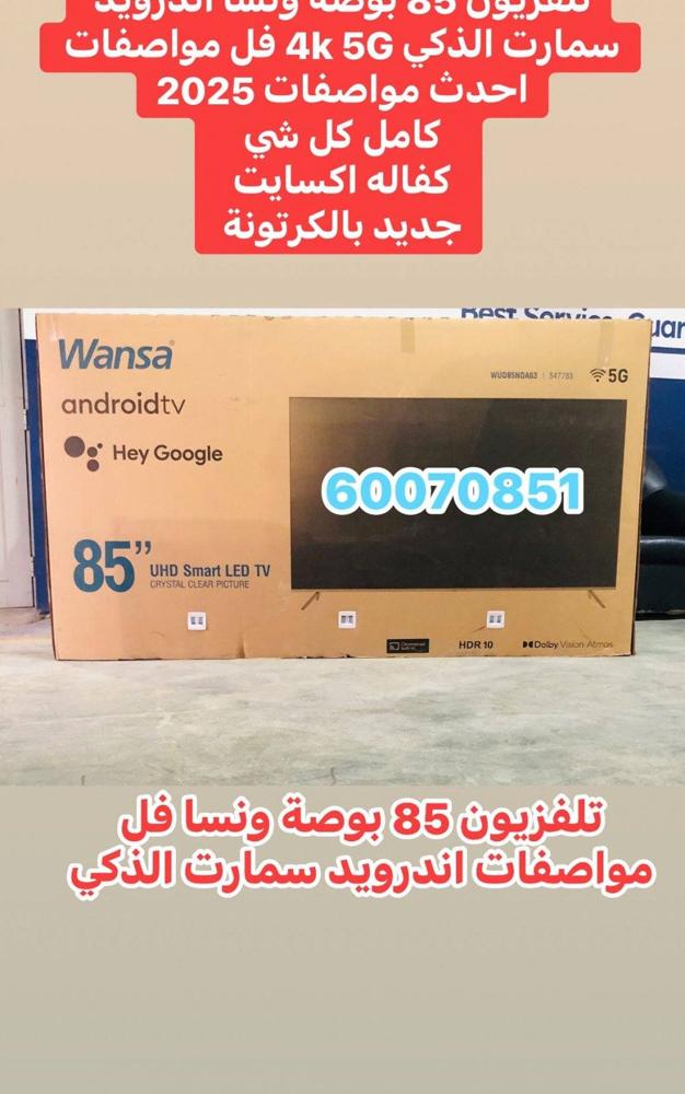 للبيع تلفزيون 85 بوصة وانسا الذكي اندرويد 4 كيه مواصفات فل بدقة 4k 5G فائق الوضوح وجميع التطبيقات الالكترونية نتفلكس شاهد نت يوتيوب والعاب ويمكنك تنزيل التطبيقات ‏جوجل تي في 4K 5G بلوتوث اير بلاي مواصفات عاليه أحدث موديل 2025 فل مواصفات كامل كل شي احدث مواصفات تلفزيون حجم 85 بوصة ونسا كأمل كل شي مواصفات فل مواصفات عاليه صوت قوي صوره مشاء الله تلفزيون جديده بالكرتونة كفاله الوكيل Xcite الغانم فقط شامل توصيل يوجد جميع الاحجام باقل الاسعار جميع انواع تلفزيونات باقل الاسعار توصيل مجانا مجانا