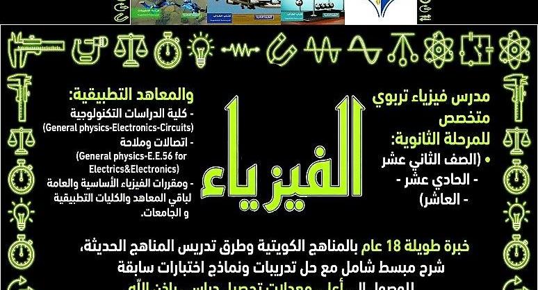 مدرس فيزياء تربوي متخصص للمرحلة الثانوية: (الصف الثاني عشر - الحادي عشر - العاشر) والمعاهد التطبيقية: -كلية الدراسات التكنولوجية (General physics-Electronics-Circuits) -اتصالات وملاحة (General physics-E.E.56 for Electrics&Electronics) -ومقررات الفيزياء الأساسية والعامة لباقي المعاهد والكليات التطبيقية و الجامعات. خبرة طويلة 18 عام بالمناهج الكويتية وطرق تدريس المناهج الحديثة، شرح مبسط شامل مع حل تدريبات ونماذج اختبارات سابقة للوصول إلى أعلى معدلات تحصيل دراسي بإذن الله. التواصل هاتفيًا أو واتساب