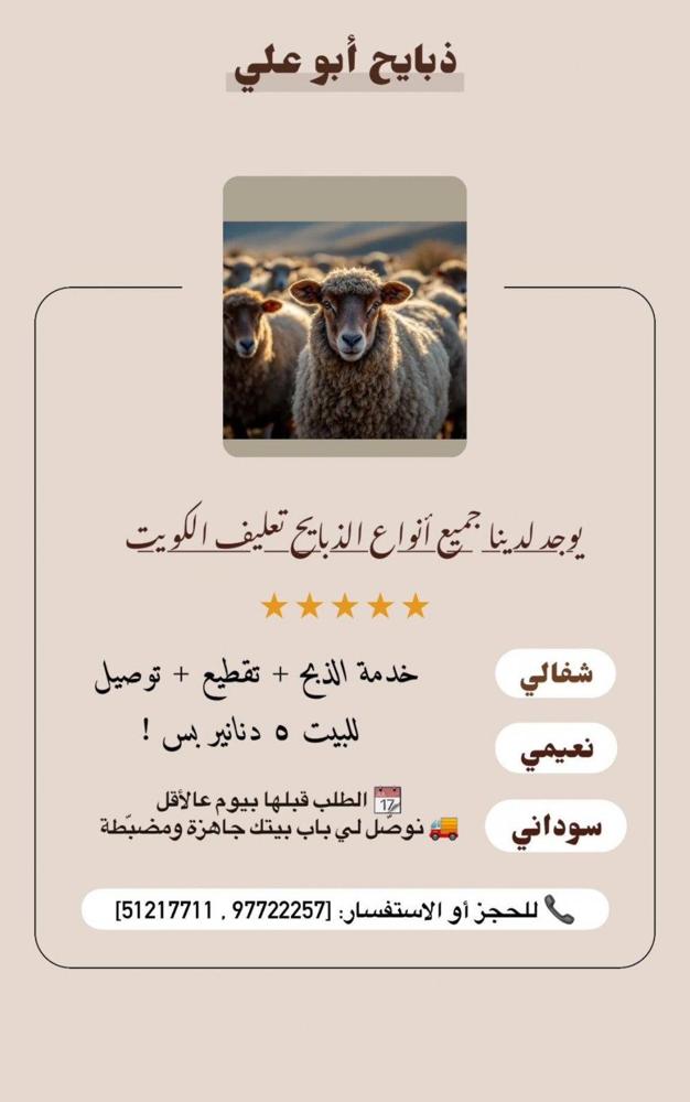 يتوفر لدينا ذبايح شفالي الأعمار من 2 لي 6 أشهر و نعيمي سوري و سوداني كما تتوفر خدمة الذبح و التوصيل ملاحظه الطلب قبلها بيوم التواصل على الأرقام