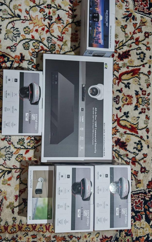 1x Ollz 8CH 12MP Smart PoE NVR 1x Dual-Sensor 180° Panoramic Camera 3x 6MP HD Turret Cameras 1x 8MP Full-Color Bullet Camera
