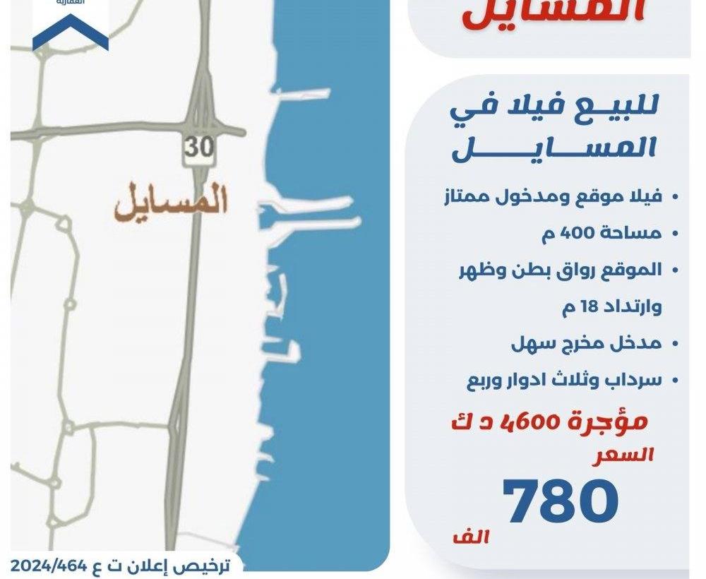 المسايل WBR واحة البيرق العقارية لبيع فيلا في المسايل • فيلا موقع ومدخول ممتاز • مساحة 400 م • الموقع رواق بطن وظهر وارتداد 18 م • مدخل مخرج سهل • سرداب وثلاث ادوار وربع مؤجرة 4600 د ك السعر 780
