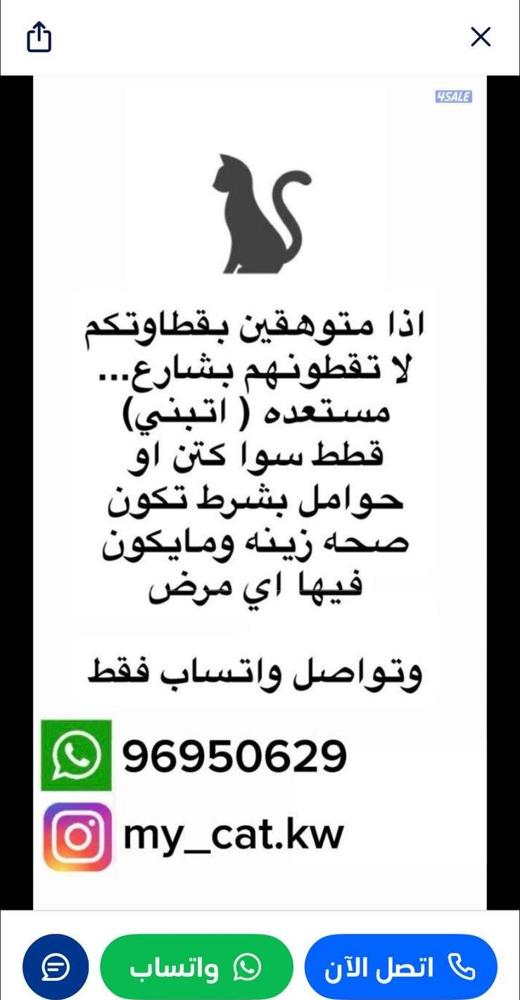 الي عنده قطاوة وصارت عنده ظروف ومايقدر يكمل في تربيته حق قطاوته فأنا مستعده اتبناهم سواء كان تبني دائم او فتره بسيطه واذا معاهم اغراضهم او لا بشرط يتم دفع ٢٥دك للفحص للتاكد من سلامه القط من جميع نواحي وخلال فتره تواجده راح يحصل على اهتمام ورعايه ماعليكم الا تتواصلون معاي ع واتساب فقط للمزيد من تفاصيل