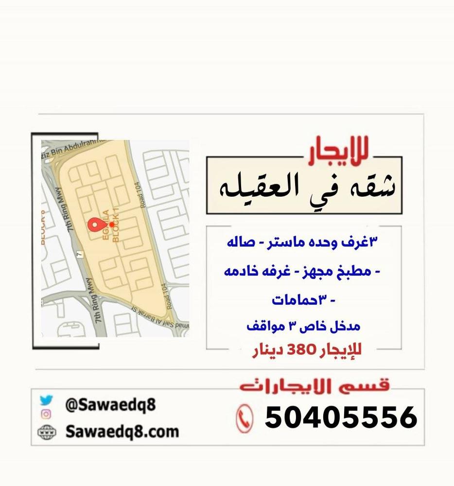 للايجار شقه السرداب فى العقيله قطعه 1 بطن وظهر على الدائري السابع ارتداد - مواقف متوفره مكون من:- 3 غرف - 2 صاله - مطبخ مجهز - غرفه خ - 3 حمامات سنترال - مصعد - مدخل خاص 3 مواقف مقابل الجمعيه والمسجد الايجار 380 دينار شامل الكهرباء والماء