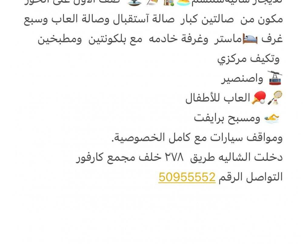 الاجار شالي كامل علا خور صف اول موقع مميز اول دخلت خيران 8 قرف ماستر صالتين ومسبح ومواقف سيارات واصلا العاب علا البحر مباشر