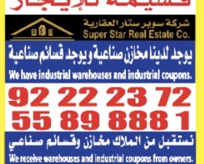 للايجار قسيمه صناعيه منطقه الري خلف مسجد العثمان المساحه 1400متر أرضي سندرة530متر ميزانيين مكيفه تكييف مرخصه مطافي 5أرقام أليه @شركه سوبر ستار العقاريه