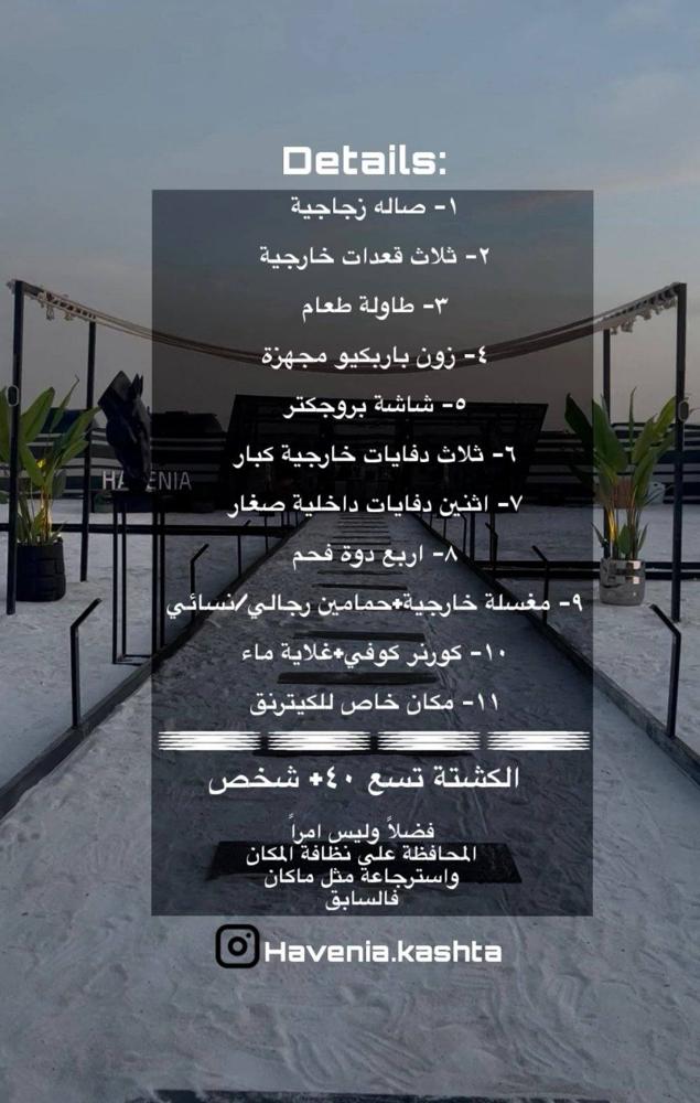 مخيم مكون من : مبنى زجاجي ٣ قعدات خارجية وحده منهم محفوره ٣ دفايات ٤ دوة فحم حمام رجال وحمام نساء طاولة بلياردو طاولة هوكي طاولة تنس بيبي فوت وغيرها من الالعاب سماعتين كبار عالمظلة بروجكتر زون للشوي مع كامل العدة شاشة متنقله عامل لخدمتكم وشب الفحم تواصل واتس اب الانستقرام : Havenia.kashta