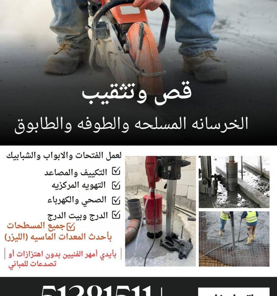 قص وتثقيب الخرسانة والمسلحة والطوفة والطابوق - عمل فتحات الأبواب والشبابيك - تكييف ومصاعد - التهوية المركزية - الصحي والكهرباء - الدرج وبيت الدرج- احدث المعدات الماسية (الليزر).