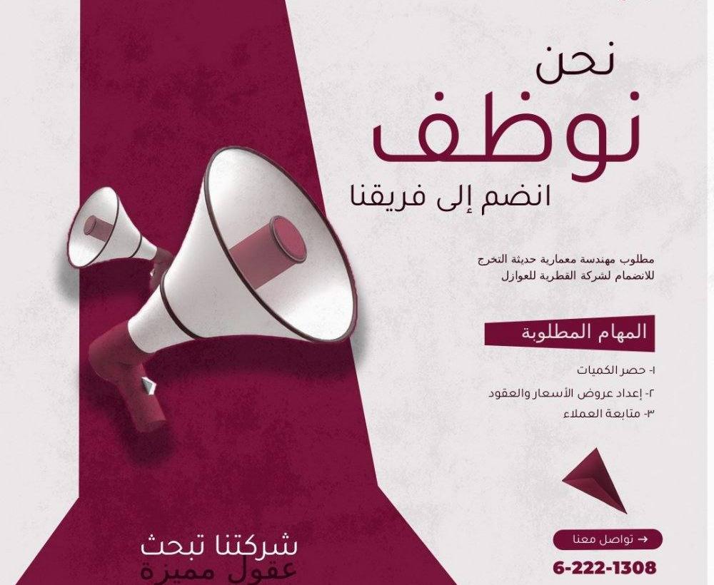 مطلوب للعمل مهندسة معمارية – حديثة التخرج تشترط إجادة أعمال الحصر وقراءة اللوحات الهندسية. لا يشترط وجود خبرة سابقة. العمل دوام كامل ومن داخل الكويت فقط. المميزات: • راتب ثابت • عمولات على العقود المتطلبات: • إقامة قابلة للتحويل • الالتزام والقدرة على العمل ضمن فريق للتقديم: يرجى إرسال السيرة الذاتية مع أعمال سابقة (إن وجدت)