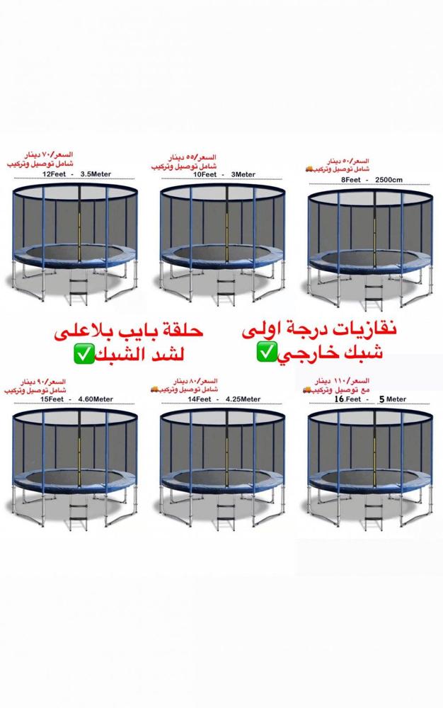 نقازيات🤹🏻درجة اولى شبك خارجي✅ اطار معدني بلاعلى لشد الشبك✅ سلم+ ربل فوق السبرنق متر ونص /25 kd ٢ متر ونص السعر/ 50 kd ٣ متر السعر/55 kd ٣،٦٦ متر السعر/ 70 kd ٤،٠٥ متر السعر /80 kd ٤،٥٠ متر السعر/90 kd ٥ متر السعر/110 kd الاسعار شامل توصيل وتركيب🚚 الاتصال او وات ساب/