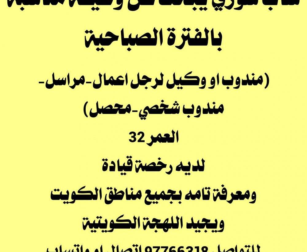شاب سوري يبحث عن وظيفة مناسبه بالفترة الصباحية (مندوب او وكيل لرجل اعمال-مراسل-مندوب شخصي-محصل) العمر 32 لديه رخصة قيادة ومعرفة تامه بجميع مناطق الكويت ويجيد اللهجة الكويتية للتواصل اتصال او واتساب