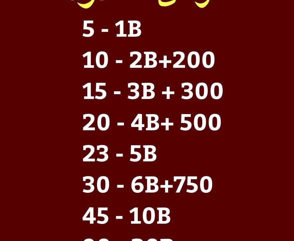 عرض اليوم : 5 - 1B 10 - 2B+200 15 - 3B+300 20 - 4B+500 23 - 5B 30 - 6B+750 45 - 10B 90 - 20B ‎للتواصل واتس اب 👇 5/0/7/6/1/4/0/9