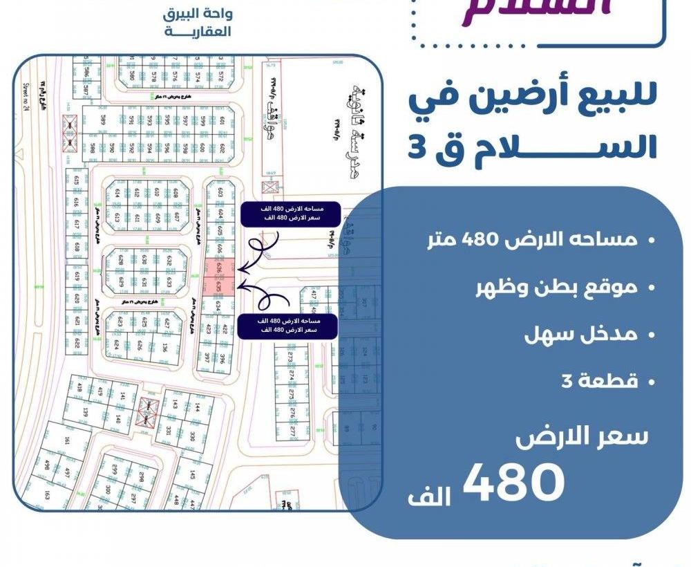 للبيع ارضين في السلام ق3 الموقع بطن وظهر مساحه كل ارض 480م شعر الارض 480 الف قرب الخدمات مدخل سهل