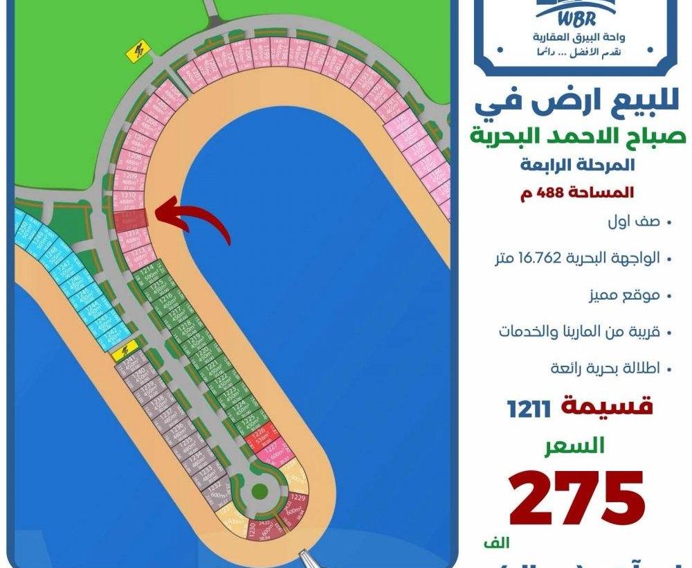 للبيع ارض في صباح الاحمد البحرية المرحلة الرابعة المساحة 488 م • صف اول • الواجهة البحرية 16.762 متر • موقع مميز • قريبة من المارينا والخدمات • اطلالة بحرية رائعة قسيمة 1211 السعر 275