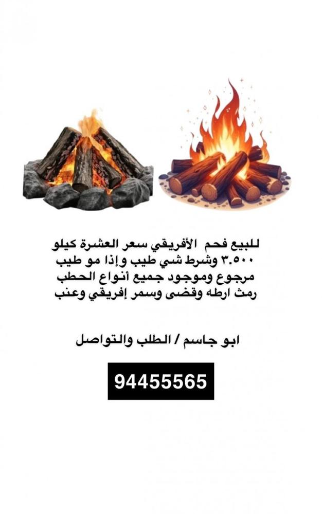 ‏للبيع فحم أبو جاسم الأفريقي سعر العشرة كيلو ٣.٥٠٠ وشرط شي طيب وإذا مو طيب مرجوع وموجود جميع أنواع الحطب رمث ارطه وقضى وسمر إفريقي وعنب
