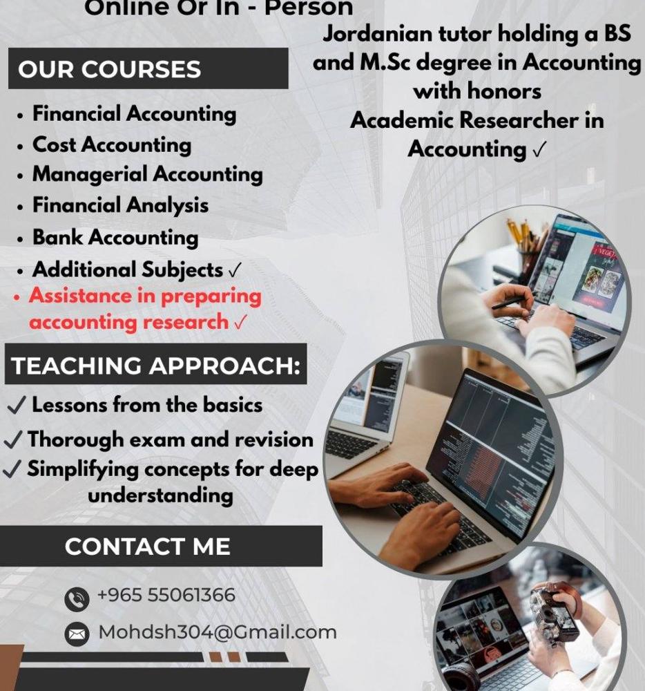 Accounting courses - دروس في المحاسبة مدرس اردني متخصص في المحاسبة (مدرس محاسبة)، حاصل على درجتي البكالوريوس والماجستير في المحاسبة مع متربة الشرف، مساعدة في الشرح لطلبة الجامعات بمختلف الدرجات، مساعدة في كتابة الأبحاث المحاسبية الأكاديمية.