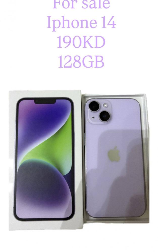 تلفون 14 مع البوكس من غير الشحن 128GB لونه بنفسجي مستعمل استعمال نظيف مافي خدش او كسر iPhone 14, 128GB, light Purple, used in excellent condition, no cracks or damage, box included, no charger.