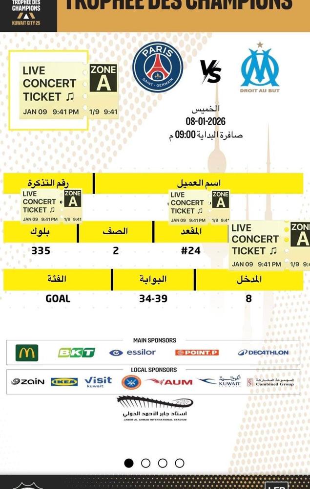 يوجد حجز ٨ مقاعد ( كل ٤ مقاعد جنب بعض ) سانت جيرمان * مارسيليا