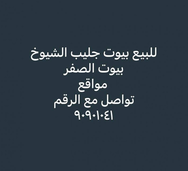 للبيع بيت في جليب الشيوخ ق4 المساحة ٤٠٠ متر راس 3 شوارع وارتداد 30 م تقريبا رواق المنطقة على دائري 6 ونص البيت مطلوب للإسكان سكن المالك 🌹🌹🌹🌹🌹🌹🌹🌹🌹🌹🌹🌹🌹 للبيع بيت بالجليب البيوت الصفر قطعه4 المساحه 400 م شارع واحد قريب من المسجد دورين بنيان حكومه به توسعه بالصاله والديوانيه مرمم من الداخل تكييف سنترال فاضي تسليم فوري (وثيقة حرة) *التفاصيل* الأرضي : دوانية بمنافعها صالتين - 2 غرفة - 2 حمام - مطبخ - غرفة س مع حمامها - حوش كبير الدور الاول : 4 غرف - 2 حمام- صالة صغيرة - مطبخ تحضيري 🌹🌹🌹🌹🌹🌹🌹🌹🌹🌹🌹 ‏تواصل مع الرقم ٩٠٩٠/١٠٤١