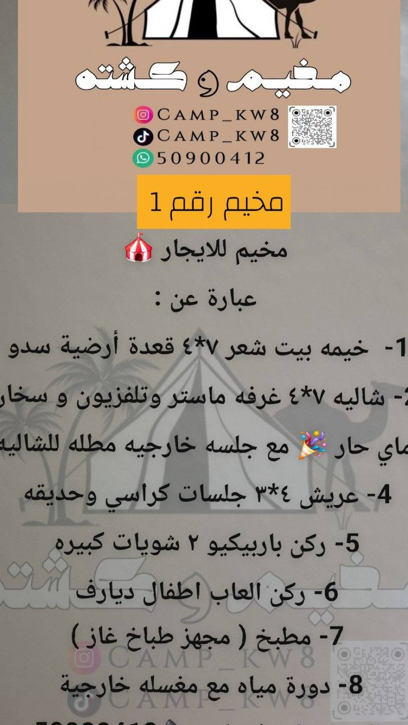 مخيم للايجار 🎪 عبارة عن : 1- خيمه بيت شعر ٧*٤ قعدة أرضية سدو 2- شاليه ٧*٤ غرفه ماستر وتلفزيون و سخان ماي حار 🎉 مع جلسه خارجيه مطله للشاليه 4- عريش ٤*٣ جلسات كراسي وحديقه 5- ركن باربيكيو ٢ شويات كبيره 6- ركن العاب اطفال ديارف 7- مطبخ ( مجهز طباخ غاز ) 8- دورة مياه مع مغسله خارجية للاستفسار واتساب 📞 خمسه صفر تسعه صفر صفر اربعه واحد اثنين