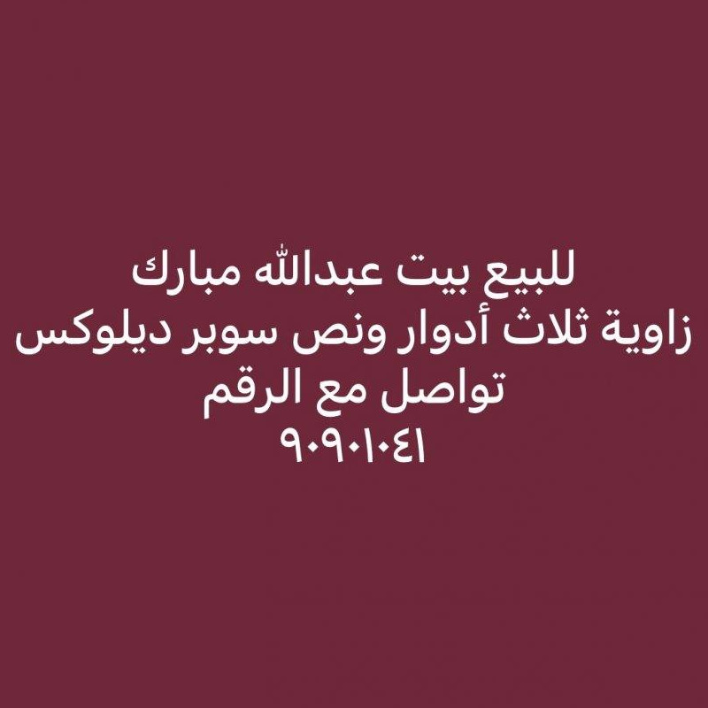 ‏ للبيع قسيمة عبدالله مبارك ق ٢ ‏تكون من ثلاثة أدوار ونص موقع زاوية الأرضي غرفتين ثلاث صالات مطبخ حمامين ديوانيه حمام علي الشارع الاول 6 غرف 4 حمامات مطبخ صاله الثاني شقتين وحده 4 غرف وصاله ومطبخ وحمامين الشقه الثانيه 3 غرف وصاله وحمامين طبع الشقق كبار الثالث شقه صغير علي السطح غرفتين وصاله وحمامين وغرفة س بروح الأرضي مفتوح علي الاول واصنصيل خارجي للمؤجرين ‏تواصل مع الرقم ٩٠٩٠/١٠٤١
