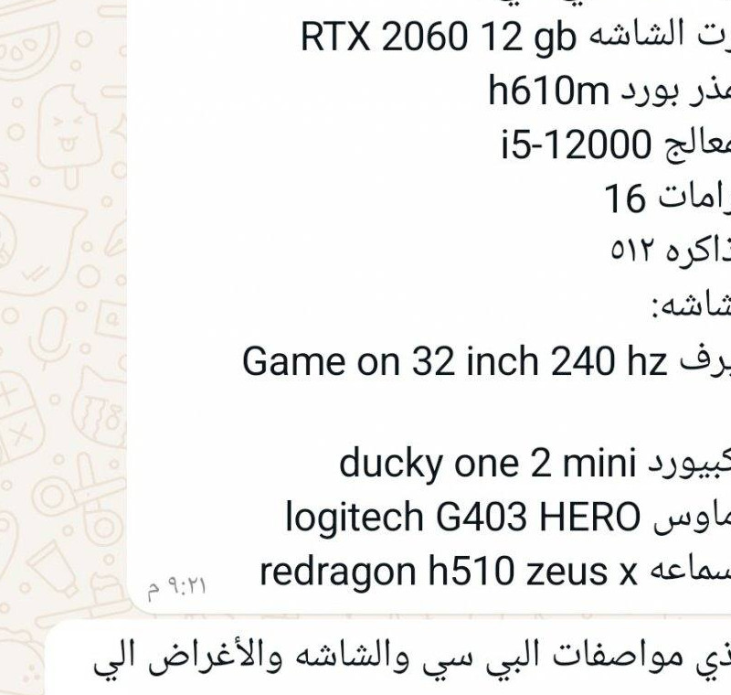 السلام عليكم للبيع pc حالته جيده جدا معاه شاشه game one 32 بوصه كيرف 240 هيرتز ومعاه كيبورد 60%ducky one2 mini سويتش احمر وماوس لوجيتيك g403 hero ومعاه سماعتين السماعه الأولى redragon وفي ليتات rgb تتغير بالريموت وتقدر ترفع الإضاءة وتنزلها والسماعه الثانيه صوتها واضح ومعاه عدد 2ماوس باد كلهم نفس المقاس 60سم 30سم وأشكاله بالصور ومواصفاته بالصور وفي حساب ستيم فيه فورزا هورايزن 4 ومحاكي الحوادث واسيتو كورسا وباتلفيلد ٦ والي له خاطر يتواصل معاي والبيسي مافيه ولا باند ولا يشتكي من اي شي وفيه كونتنت مانجر فيه سياير واجد ومعاه جميع ملحقاته وايراته وكراتينه والتواصل للجادين فقط